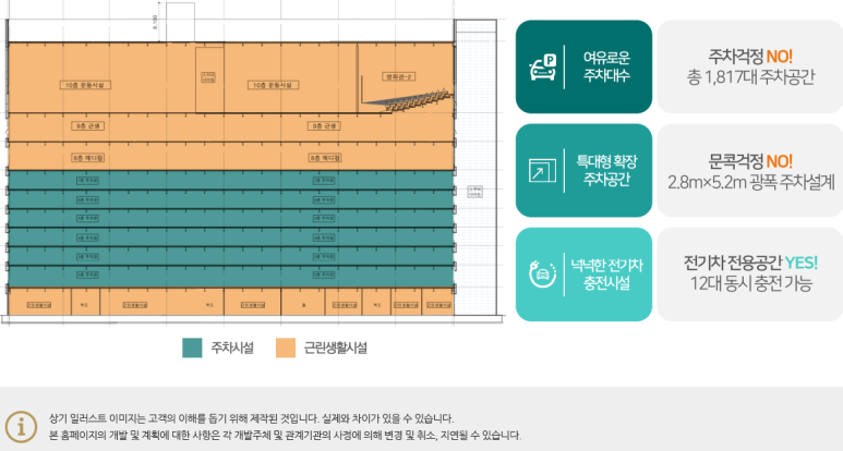 총 1,817대의 광폭 주차공간 설계! 상가 이용객 약 7,000명 동시 수용가능! (차량 1대 X 4인 기준)
