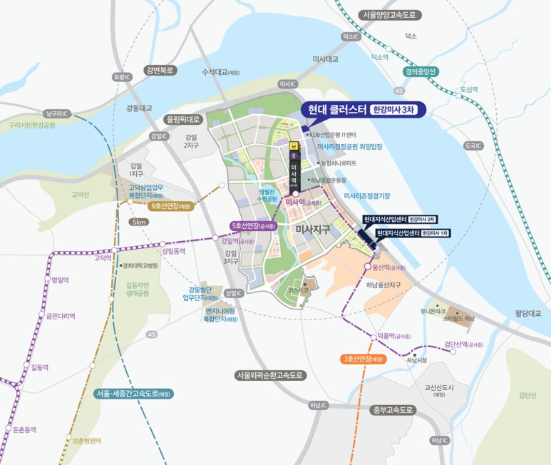 수석대교(예정), 지하철 5호선 미사역(예정), 9호선 연장(계획) 등 뛰어난 광역 교통망