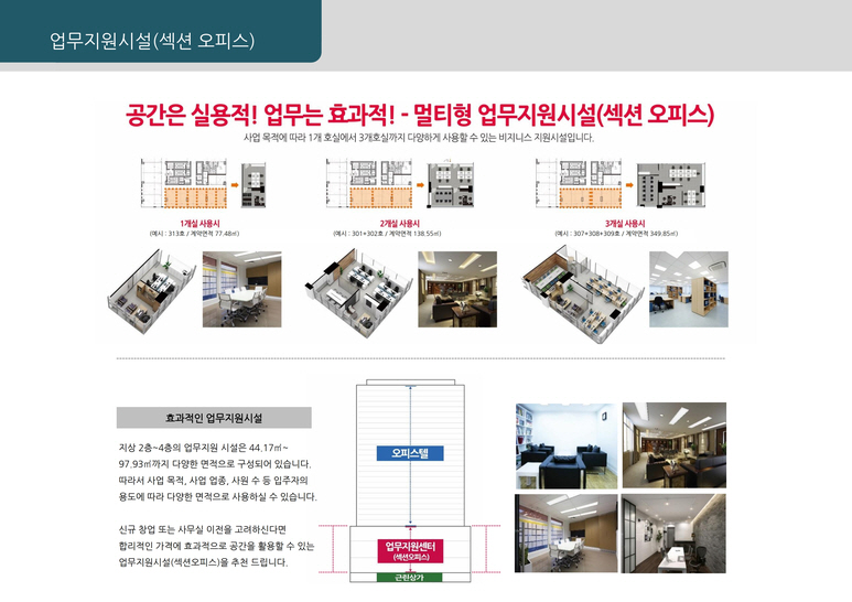 지상 1층은 상업시설로, 2~4층은 업무지원시설(섹션 오피스)로 이루어지며 오피스는 각 호실별 입주자의 사업 성격에 따라 1개 호실, 2개 호실, 3개 호실, 다양하게 사용면적을 선택, 분양 받을 수 있습니다.