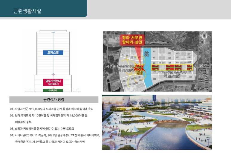 사업지 인근 약 5,000실의 오피스텔 단지 중심에 위치해 집객에 유리하며, 청라 국제도시 약 10만여명 및 국제업무단지 약 18,000여명 등 배후수요가 풍부합니다.