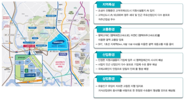산업단지를 기반으로 한 고덕신도시 내 입지, 삼성전자 인접으로 협력업체 등 임차 수요 풍부 예상