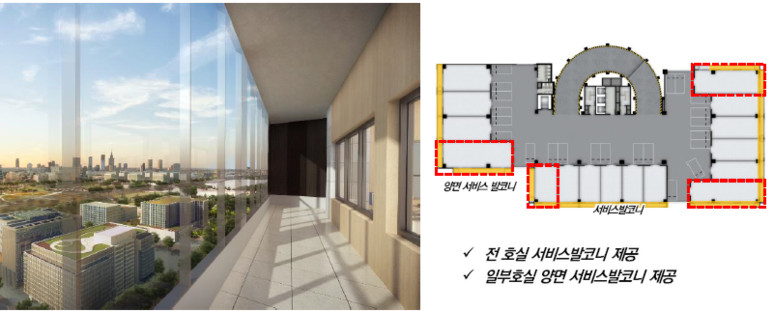 전 호실 서비스 발코니 제공 + 일부호실 양면 서비스 발코니 제공