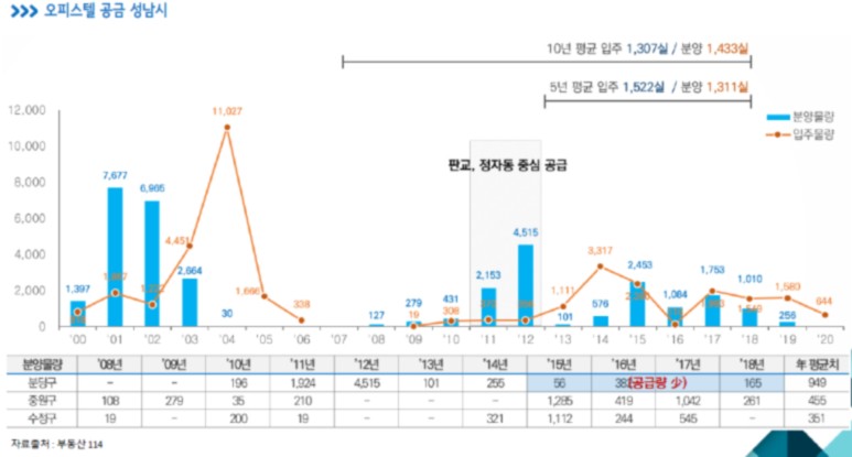 판교 테크노밸리 기업체 입주 랠리 -> 성남시 택지 부족으로 오피스텔 공급 부족