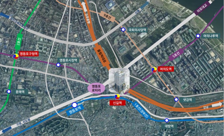 여의도와 인접해 있고 , 올림픽 대로와 지하철 1호선, 5호선이 지나가고 있음
