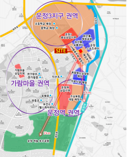 - 북서측 운정3지구 개발 권역, 남서측 가람마을 기공급 주거단지 권역, 남측 운정적 권역이 위치하여 사업지를 중심으로 3개 권역을 도보로 이용 가능한 주거복합단지