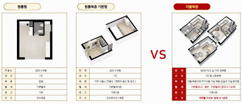 일반 원룸의 경우 임대료 및 우선순위 한계점 더블 복층의 경우 높은임대료 및 임대 우선순위