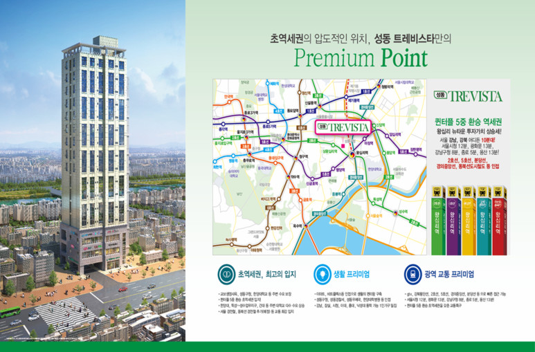 - 지하철2호선, 5호선, 분당선, 경의중앙선, 동북선경전철 왕십리역이 직선거리 200미터내에 위치한 퀸터플역세권임