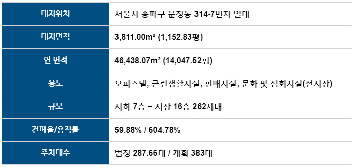- 지하철 8호선 문정역 도보 6분거리 (약 340m) 위치로 업무권역 (GBD) 10분대 진입가능