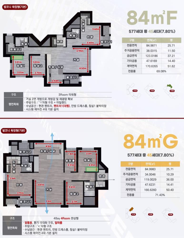 84G 타입은 알파룸을 포함한 4Bay 4Room 구성으로, 가족 구성원이 많거나 공간 활용도를 중시하는 수요층에게 적합한 구조입니다.