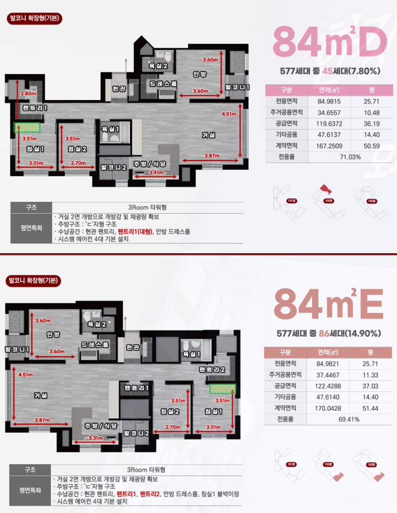 84D/E/F 타입은 타워형 구조로, 2면 개방 거실이 적용돼 채광과 통풍이 탁월하며, D타입은 ㄷ자형 주방, E타입은 팬트리 2개 제공 등 특화 설계가 돋보입니다.