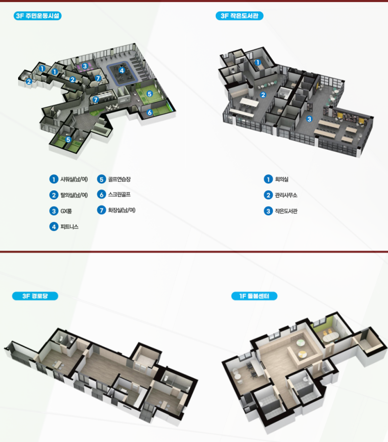 커뮤니티 시설 또한 세대 구성과 실수요자의 생활을 고려한 구성입니다. 1층에는 보육시설이 마련되며, 3층에는 작은도서관, 돌봄센터, 경로당, 피트니스, GX룸, 골프연습장, 스크린골프장 등 폭넓은 커뮤니티 시설이 조성됩니다. 단지 내에서 다양한 연령대가 만족할 수 있는 환경이 마련되어 있습니다.