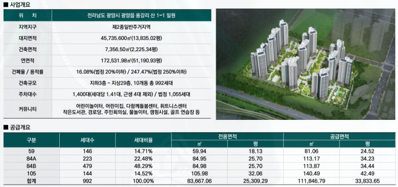 광양 푸르지오 센터파크는 전라남도 광양시 용강리 산1-1 일원에 들어서는 대단지 주거 단지로, 총 992세대, 지하 2층~지상 29층 규모로 조성된다. 제2용강 일반주거지역에 위치해 있으며, 남해고속도로 광양IC까지 차량 약 5분 거리로 순천, 여수, 동광양 주요 도심권으로의 이동이 매우 편리하다. 이 지역은 기존 주거지와 산업단지, 상업시설이 공존하며 균형 잡힌 도시 구조를 갖추고 있어 실거주 수요가 꾸준히 이어지는 곳이다.