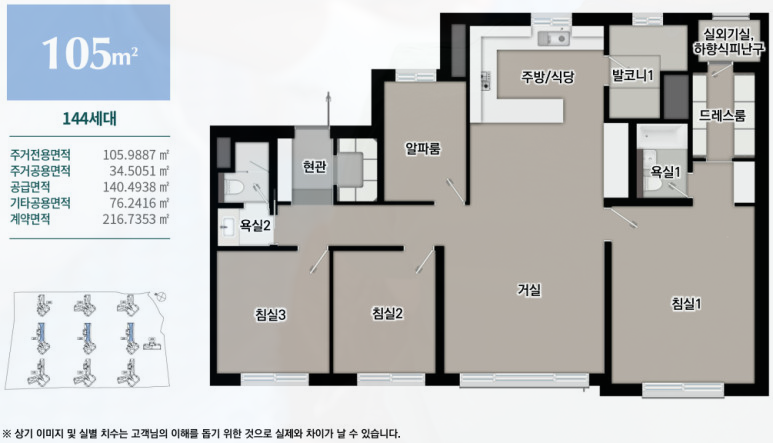 105㎡는 대형 거실과 넓은 주방, 드레스룸, 알파룸을 갖춘 프리미엄 구조로 여유로운 생활이 가능하며, 대가족이나 부모님을 함께 모시는 3세대 가구에게도 적합하다.