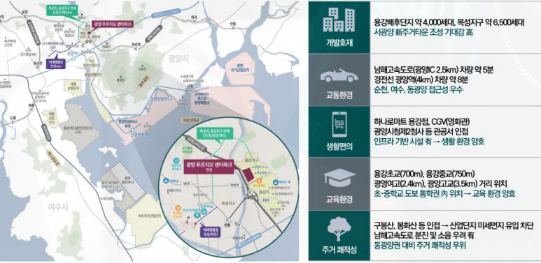 광양시는 산업단지와 주거지, 항만 물류 인프라가 조화된 도시로, 광양제철소, 광양항 물류단지, 동광양산업단지가 인근에 위치해 있다. 이러한 산업 기반 덕분에 직주근접성이 높고, 꾸준한 지역 유입 인구가 발생하고 있다.