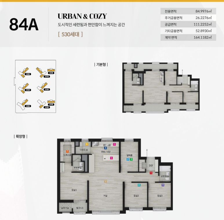 84A (530세대): 공간 효율이 뛰어난 실속형 구조로, 주방과 거실이 일체형으로 이어져 개방감이 좋습니다.