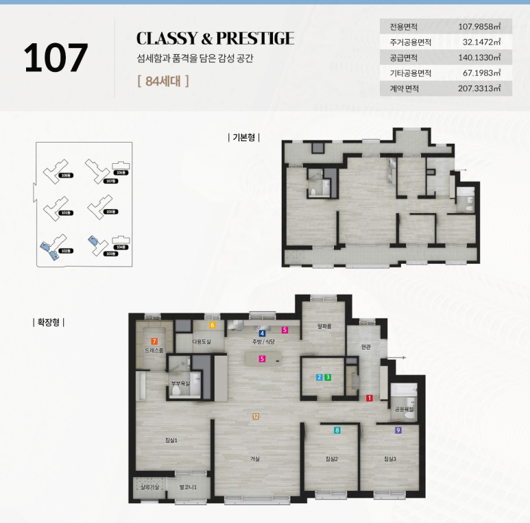 107 (84세대): 4Bay 구조와 넓은 거실을 중심으로 설계되어, 중대형 평형의 여유로움을 느낄 수 있습니다.