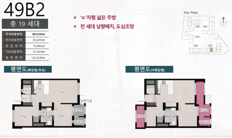 ㄷ자형 넓은 주방으로 수납공간이 풍부하고, 실외기실과 발코니를 분리해 활용도를 높였습니다.